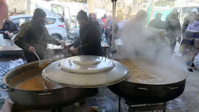 Deprem bölgesinde yaraları sarmak üzere çabalarını sürdüren TTYD, Hatay Kırıkhan’da depremzedelerin sıcak yiyecek ve içecek ihtiyacını karşılıyor. TTYD ekiplerinin soğuk havada sıcak çorba ikramı depremzedelerin içini ısıtıyor.